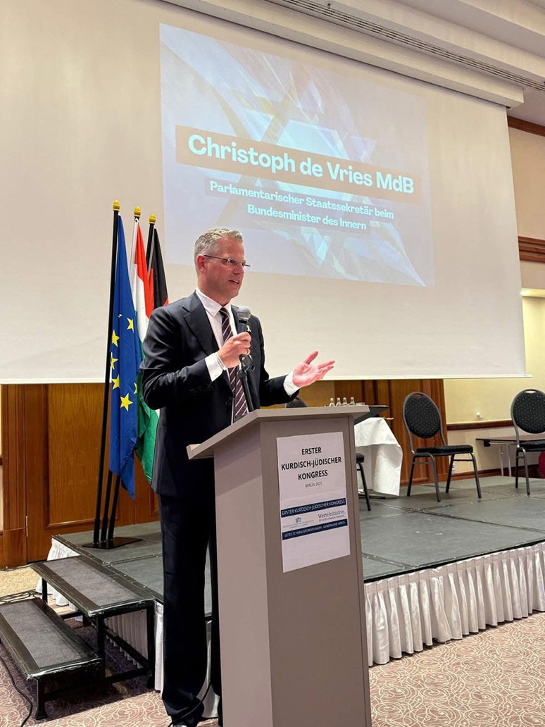 Aydınlık’ta yer alan haberde, kongrenin açılış konuşmasını da Alman İçişleri Bakanlığı temsilcisi Christoph de Vries yaptı. Vries, 7 Ekim’deki Aksa Tufanı’nı kınadıklarını belirterek, Yahudiler ve Kürtlerin aşırılığa karşı yan yana olduklarını öne sürdü. İsrail’in Almanya Büyükelçi Yardımcısı Guy Gilady de toplantının konuşmacıları arasındaydı.