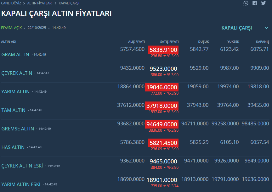 Kapalı Çarşı’da sabah saatlerinde 6.123 liradan işlem gören altın, 5.842 liraya kadar geriledi. Aynı şekilde gram altındaki kayıp da 285 lirayı buldu ve şu an gram altın 5.838 liradan alıcı buluyor.
