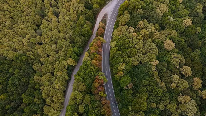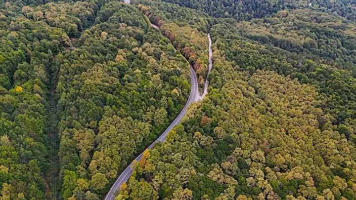 Ormanlık alandaki ağaçların bir kısmı sarıya, bir kısmı ise turuncuya dönüştü. Renklerin birleşimiyle yol üzerinde adeta görsel şölen sundu.