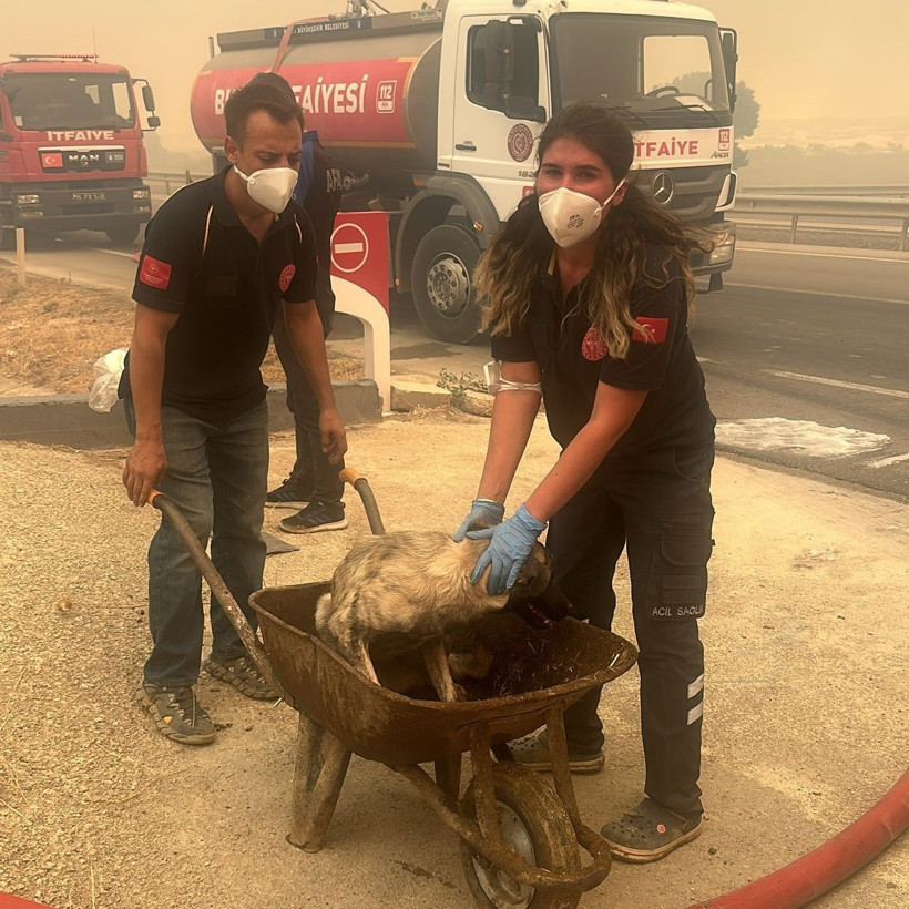 Yangından etkilenmiş bir köpek görevliler tarafından kurtarıldıktan sonra görüntülendi.