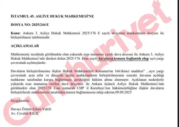 Erkan, bu kez İstanbul İl Kongresi ile Ankara’daki kurultay davasının birleştirilmesine yönelik talepte bulundu.